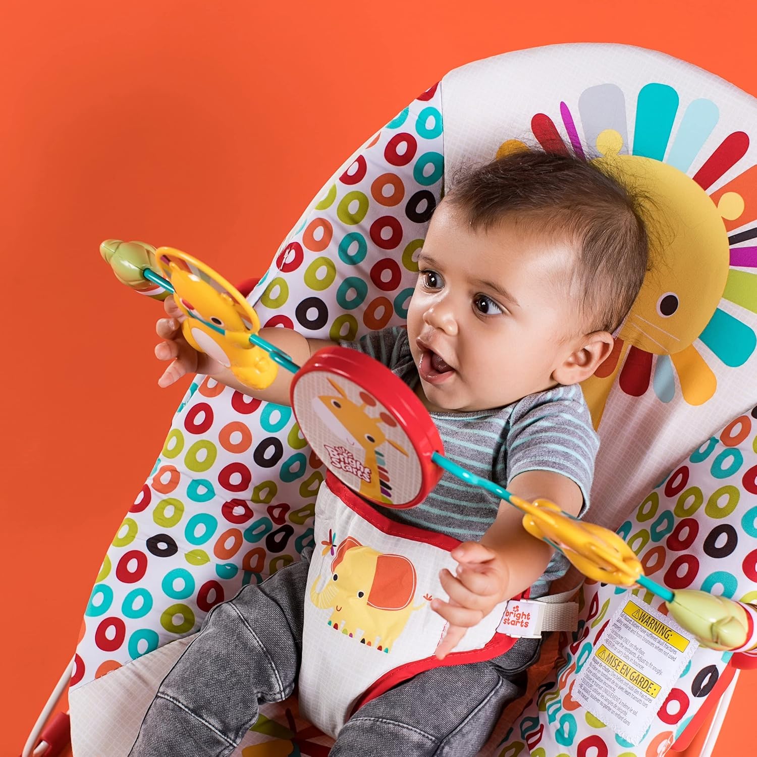 Product Description The best-selling Playful Pinwheels vibrating bouncer from Bright Starts is made just for your little one: a babies-only hangout where the only ticket to entry is adorableness. Spin up sweet moments with this unisex infant bouncer from the #1 manufacturer of bouncers*. This bouncer features a colorful pinwheel design and helps keep baby calm and safe with smooth vibrations and adjustable 3-point harness. A toy bar hangs above the bouncer seat with 3 cheerful toys including a lion, elephant, and baby-safe mirror that baby can spin and spin to encourage the development of motor skills. Say hello to cause and effect discovery with each reach and bat! When you’re ready to scoop up your baby, easily move the toy bar out of the way or remove it from the baby bouncer entirely. With a lightweight and portable design, baby’s happy place can always be with you. Simply lift on each side when baby is not in the bouncer to move from room to room. Third-party safety tested and approved; designed in the USA; thousands of reviews. (*Circana, Retail Tracking Service, U.S., Bouncers, dollar sales, 12 months ending October 2023) Brand Story By Bright Starts