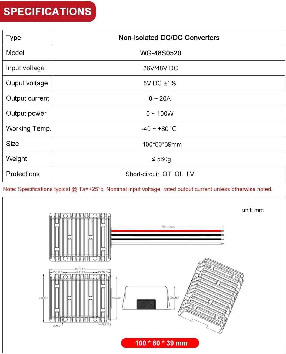 • 1PCS DC 36V/48V to DC 5V 20A 100W Step Down Buck Converter Regulator Car LED Switching Power Supply Voltage Reducer for Golf Cart